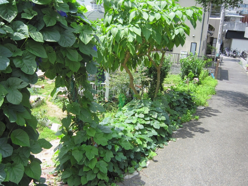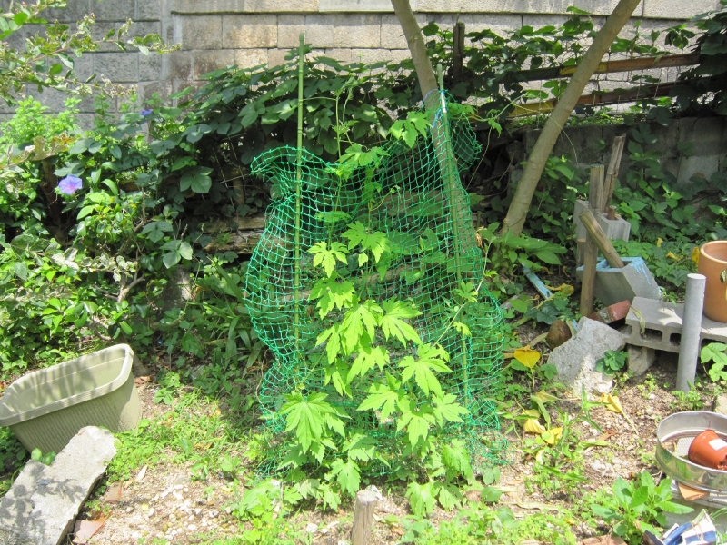 いよいよ西表アサガオが咲きはじめました。あ~夏です。アジサイは満開、今年はいちじくがたくさん実をつけています。ムクゲの花も咲きました。1か月前に植えたゴーヤの苗がつるをどんどん伸ばしています。今週末から生駒基金の助成で、いよいよ土手の工事が始まります。