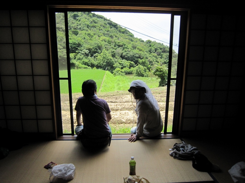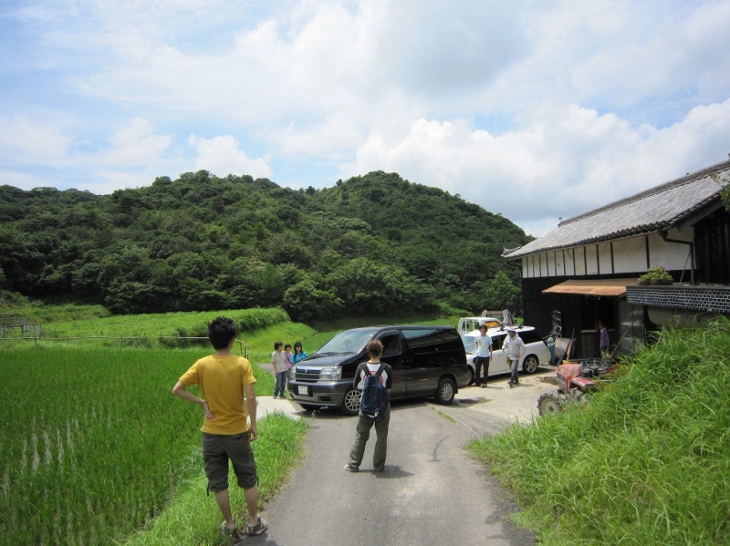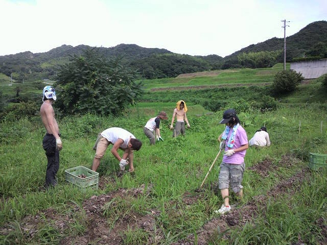 激しい前夜の大雨とは打って変わって、猛暑の中、淡路へ車を走らせた。子どもとスタッフ合わせて11名の農業チーム。洲本から中央へすこし入りこむと、もう周りは田んぼと畑だけが広がり、町のど真ん中から、わずか2時間で、豊かな自然が広がる田舎に転がり込んだような、不思議な感覚に浸る。「すごい田舎でしょう。」と橘さんが笑顔で迎えて下さった。周りには竹藪があり、池もあり、養蜂もてがけておられた。風の通る広い和室に円陣を組んで各自お弁当をひろげる。トトロのお家のような開け放された座敷から、まわりの風景をながめながら「すっかり夏ですね。」と心地よい風を受けながら言ってみる。稲が青々しげり、向こうの小高い丘の上に入道雲がはりついている。都会では感じれない季節感を堪能して、じゃがいももしっかり掘って、無事もどってまいりました。いまフリースクールの水槽には、子どもたちが淡路で採集したカブトエビとミズスマシがせわしなく泳いでいます。次は、8月半ばトマトの収穫とバーベキューを楽しみにお伺いする予定です。