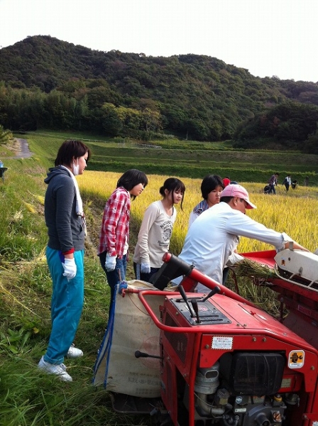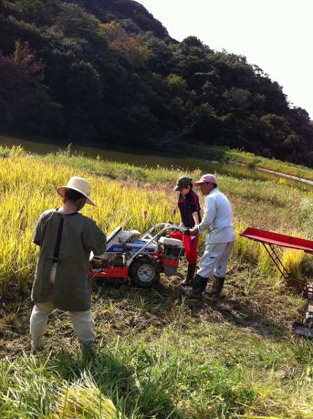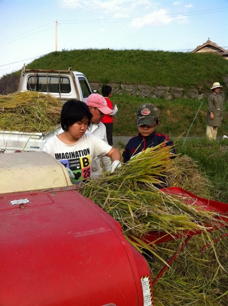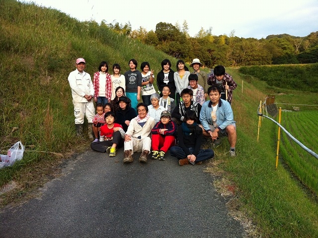 晴天にめぐまれ、3台の車に21名の大人と子どもが乗り込み、南淡路の田んぼへでかけ、お米をいっぱい収穫してきました。