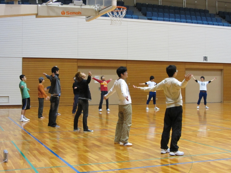 神戸学院大学の学生を中心にしたダブルダッチのメンバーとの交流が盛んで、2ヶ月に1回くらい神戸中央体育館でパフォーマンスがある。その前座に行われるのがラジオ体操。はい、みんな気合を入れていきましょうとリーダーのシンゴ君は声をはりあげる。