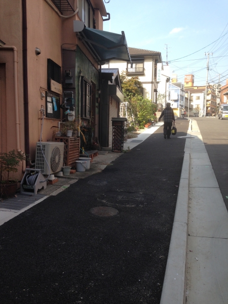 フリースクールの歩道がひろがり、電柱が抜かれて、スッキリしました。破れたテントが目立ちます。